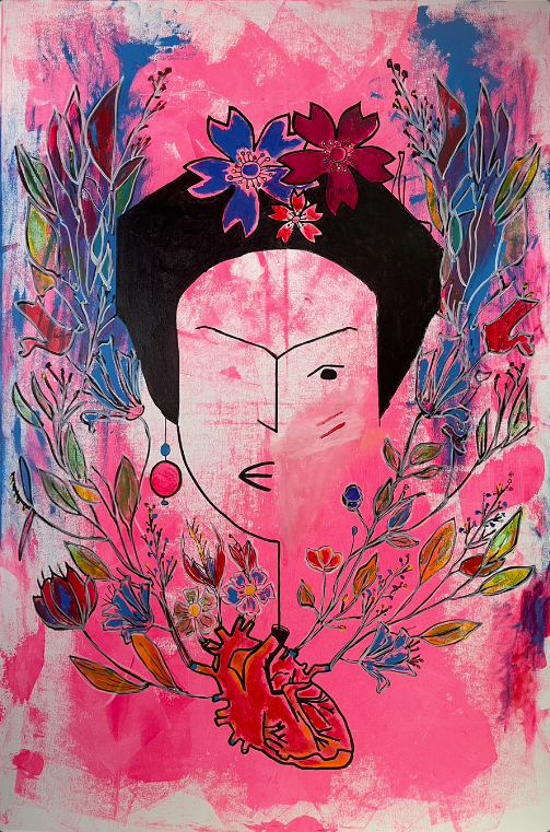 Description: "No Heart, No Art," encapsulates the essence of Frida Kahlo's passionate approach to painting. At the center of the piece is a human heart, depicted in its raw anatomical form, yet vibrant and full of life. From this heart, a cascade of flowers emerges, rendered in bold, vivid colors that stand out against the minimalist portrait of Frida.